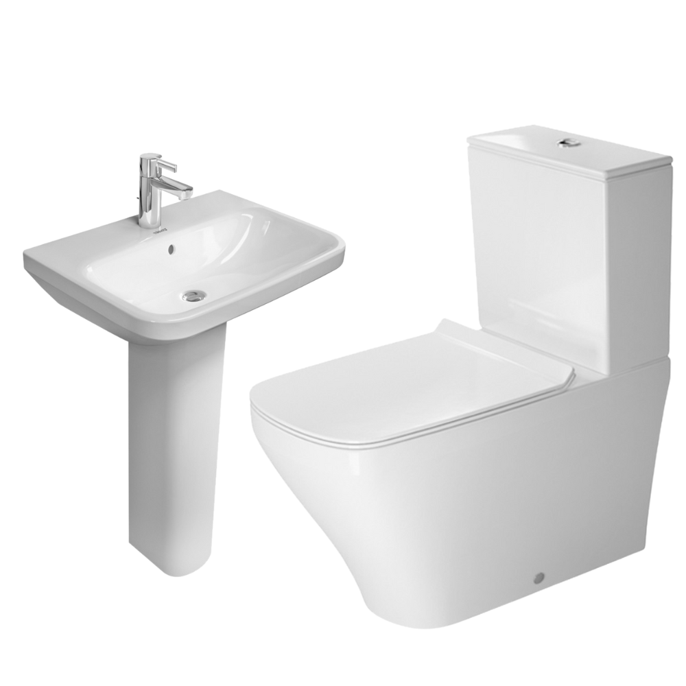 طقم حمام ديوراستايل كومفورت ( كبير ) مرحاض ملاصق بالخزان و السيديلى العادى و حوض مقاس 60 سم بالعامود الطويل اللون أبيض من ديورافيت