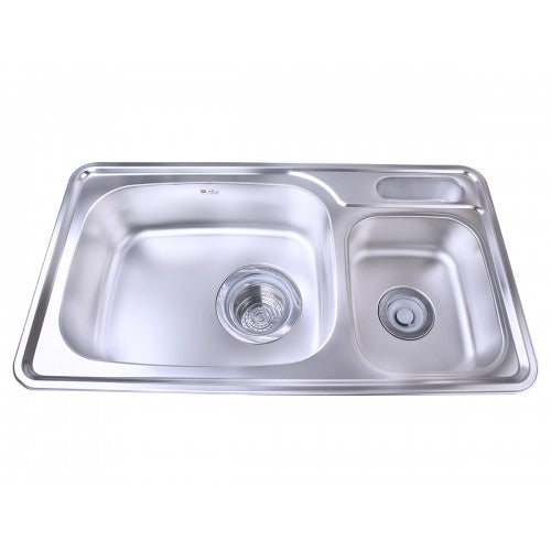 حوض Golden 870 مقاس 87 × 48 سم عدد 2 عين ستانليس ستيل غير قابل للصداء بسلة نقع و صفاية خضروات و ضاغط صابون بصرف 3 بوصة كورى من بيورتى