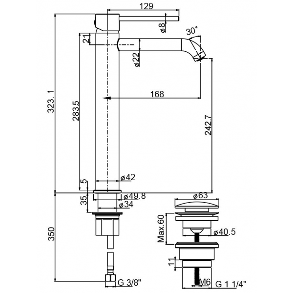 خلاط حوض عالى سكالا SC1040004E10 قنطرة عالية مقاس 24 سم بالفيداج قلب سيراميك بمحدد درجة حرارة و منظم لتوفير المياة و فلتر سهل التنظيف اللون كروم من ديورافيت